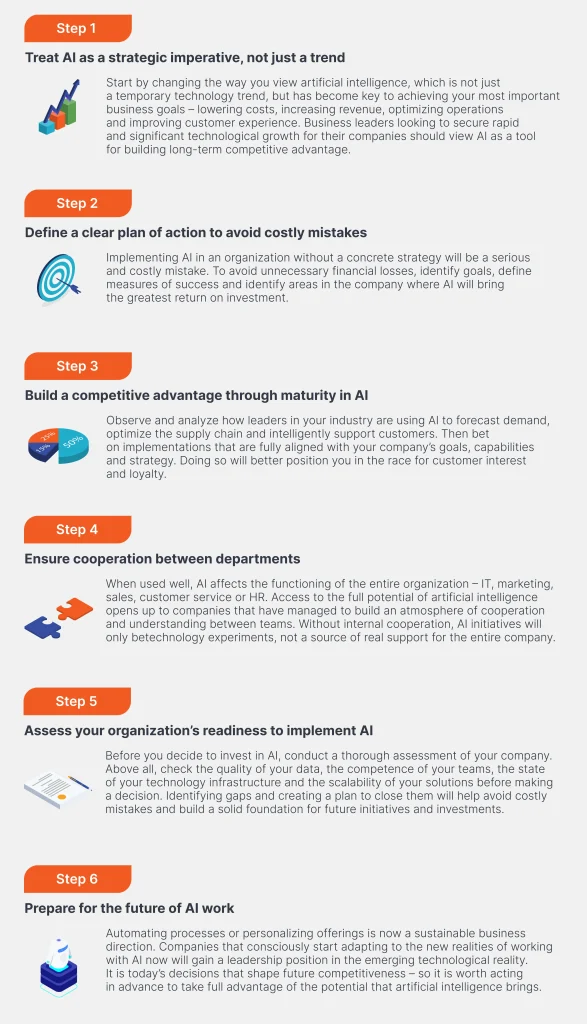 - The most important step in the AI implementation process is to analyze the company's maturity in this area – key factors include data availability, team competence, infrastructure and governance mechanisms.